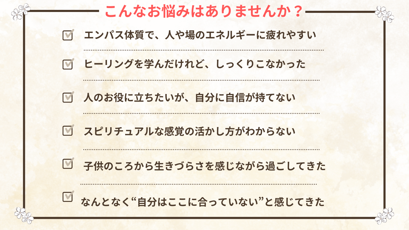 エンパス体質の私はずっと「人の影響を受けやすい自分」を責めていましたが、この講座でその感性が“癒しの才能”だとわかり、自分を受け入れられるようになりました。